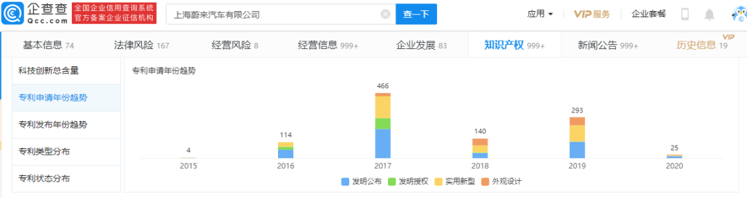 对比蔚来汽车(仅摘取上海蔚来汽车有限公司数据)的专利申请公布数据,同样发现,专利数量在2017年开始,有明显提升,2019年表现较为突出。