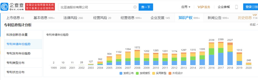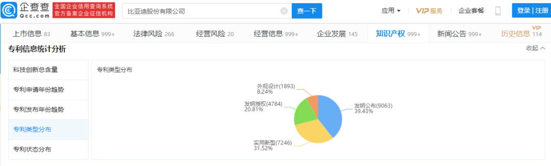 通过企查查进一步查询获悉,比亚迪专利目前以发明专利为主,其次是实用新型专利;